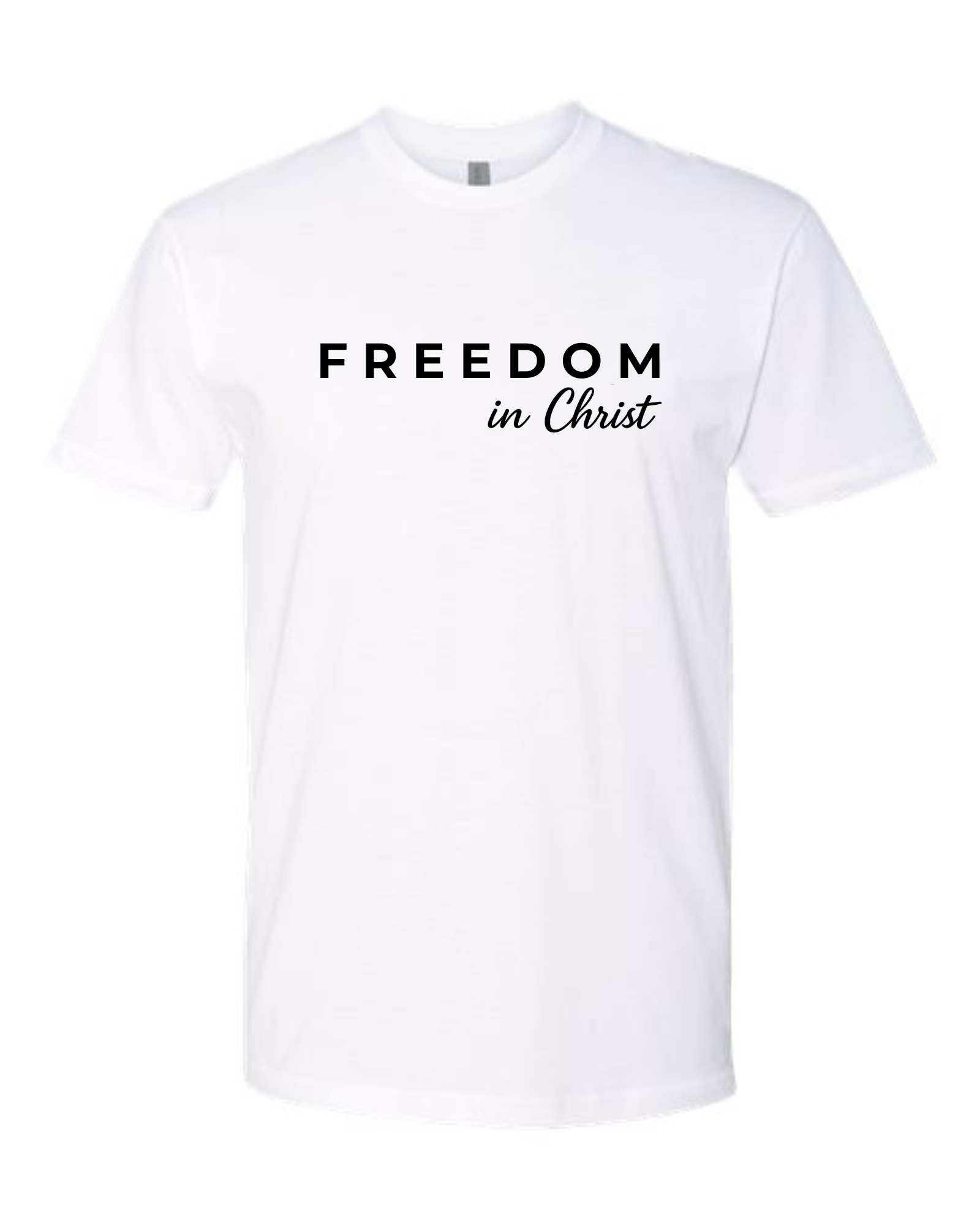 Declare your faith boldly with this minimalist yet powerful design. The word FREEDOM is displayed in strong, spaced-out block lettering, symbolizing strength and clarity, while “in Christ” flows beneath in elegant script, adding a touch of grace.