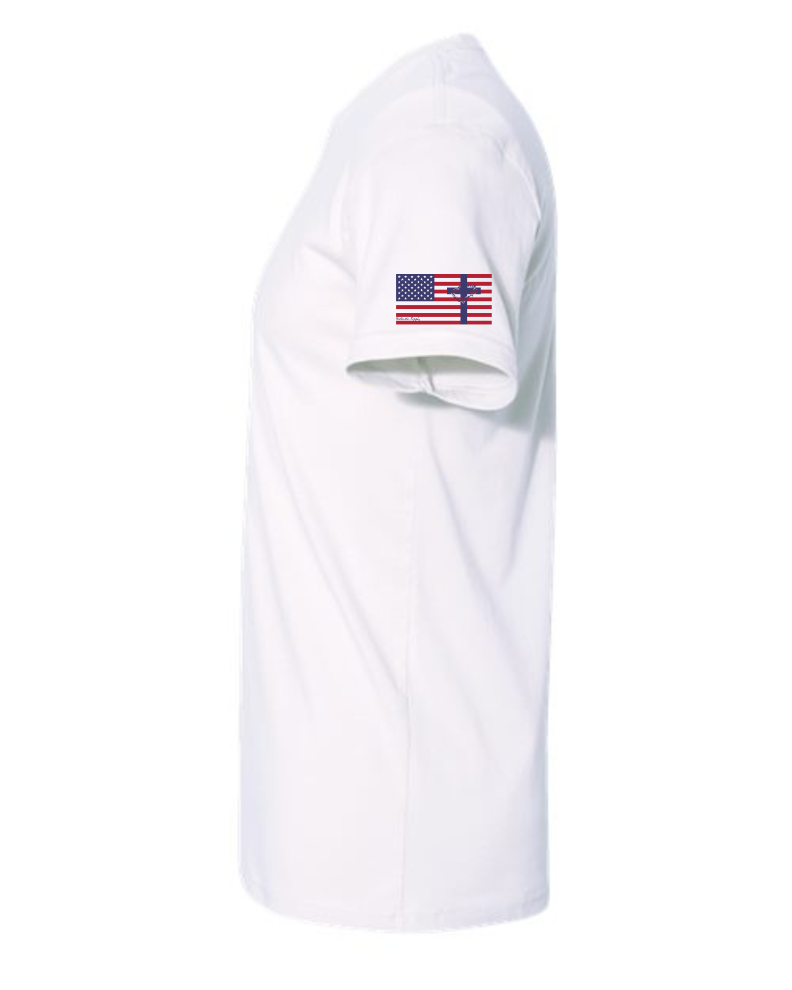 The left-sleeve design. A clean American flag is accented with a Christian cross, symbolizing faith and freedom. Beneath it, the Backwater Supply name flows in elegant script, giving the design a refined yet rugged finish.