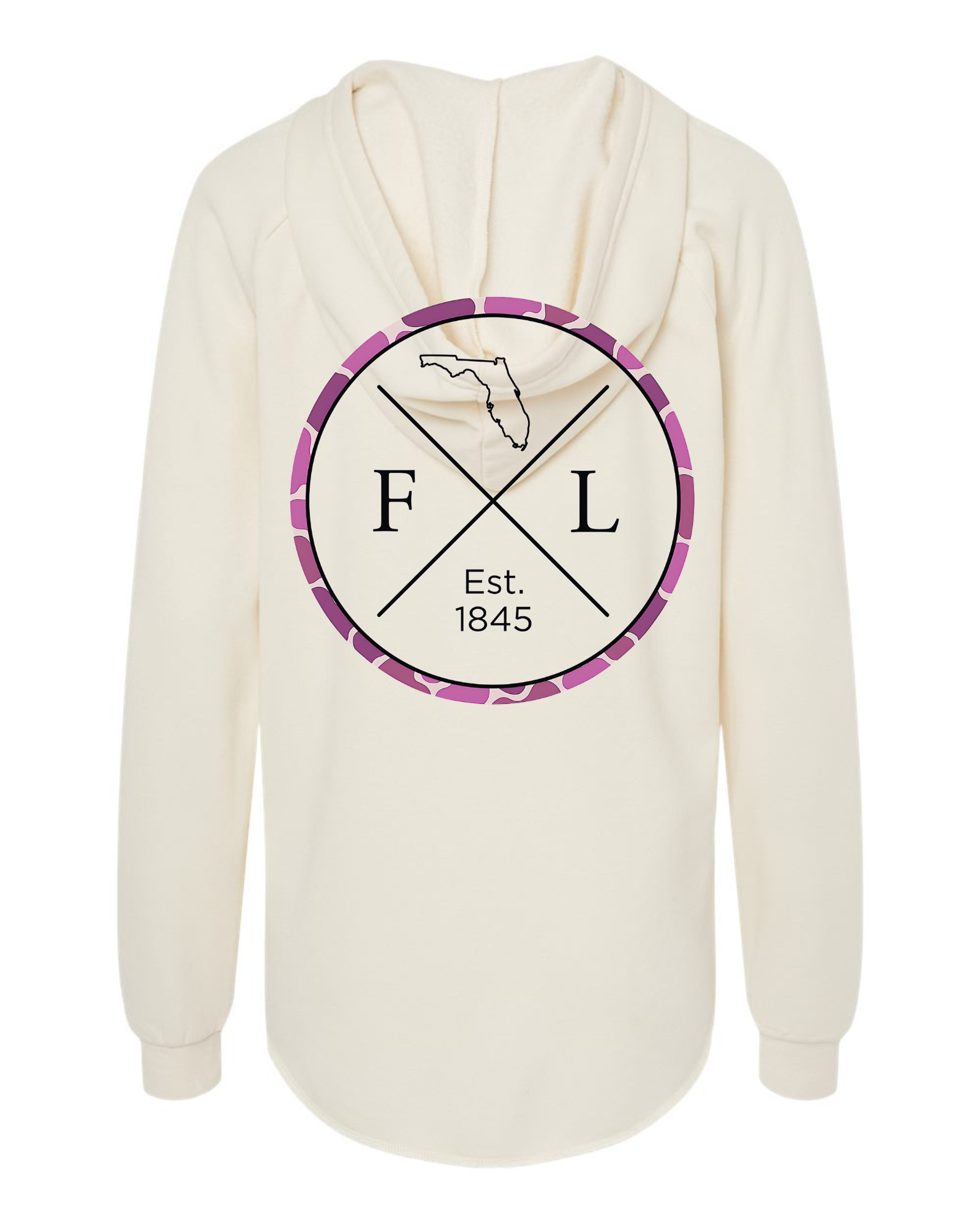 Celebrate Florida pride with a girly twist. This hoodie features a bold FL heritage crest design with “Est. 1845” and a vibrant pink camo circle for a stylish outdoors-meets-lifestyle vibe. Perfect for pairing with jeans, shorts, or layering for a casual Florida-chic look.