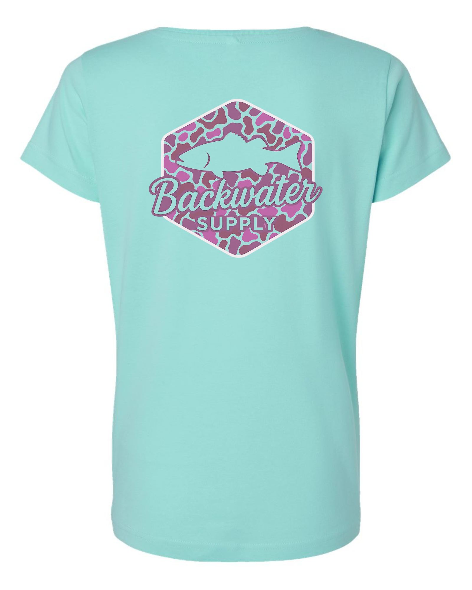 Make a statement on the water and beyond with the girly Camo fish design. Featuring a sleek snook silhouette framed inside a hexagon of bold purple camo, this piece blends Florida’s fishing culture with a modern, eye-catching style. The Backwater Supply logo ties it all together, representing heritage, grit, and a love for the outdoors.