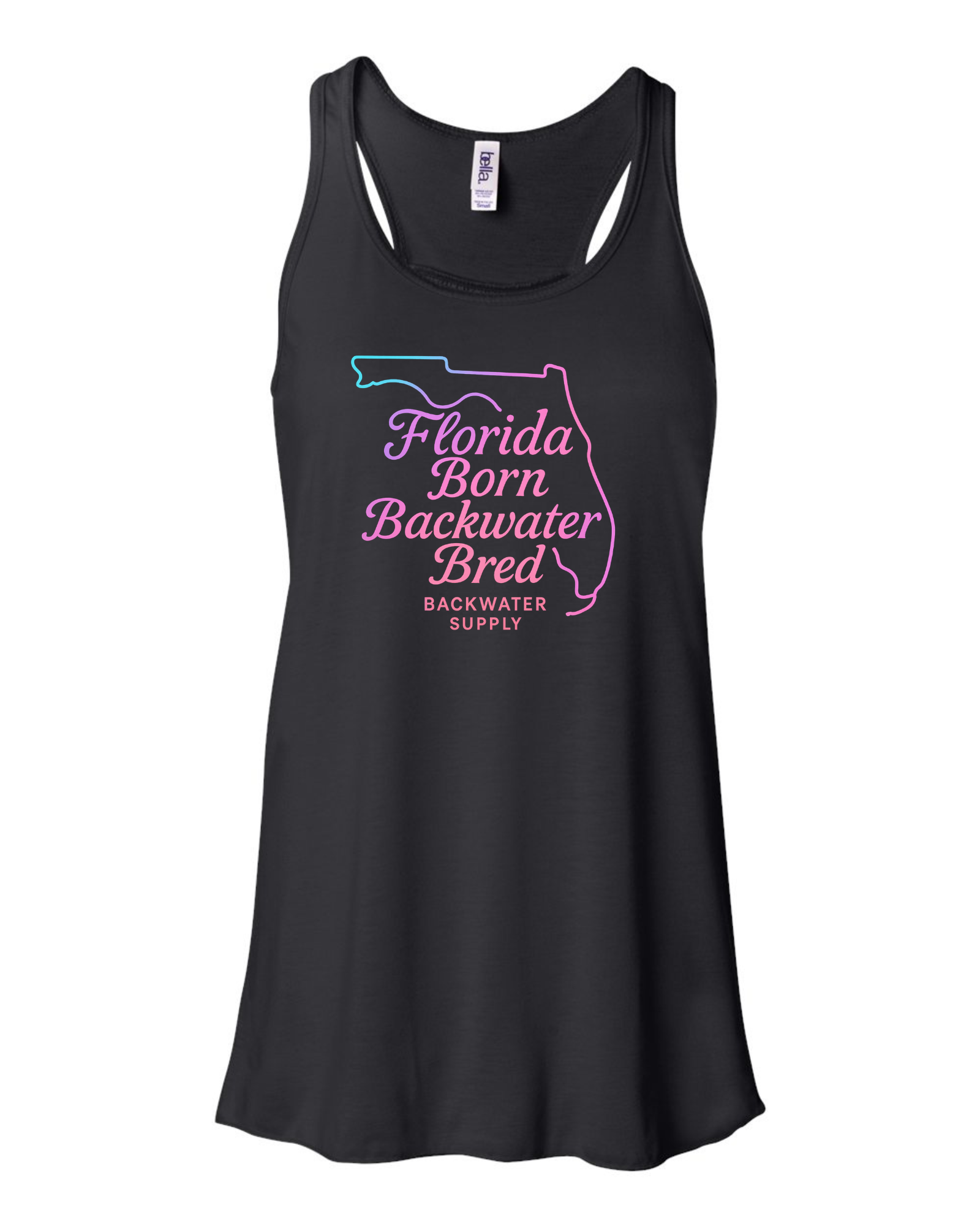 Show your Florida pride in bold, neon-inspired style with the Florida Born Backwater Bred Flowy Tank. Designed for women who are backwater raised and coastal strong, this tee pairs comfort with an iconic Florida silhouette and retro glow lettering.